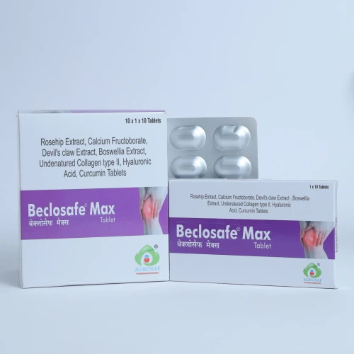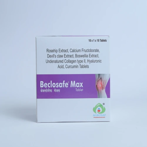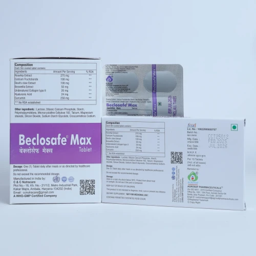 | Description: | BECLOSAFE MAX Tablet is an advanced nutraceutical formulation designed to support joint health, improve mobility, and reduce inflammation. It contains Rosehip Extract 275 mg, Calcium Fructoborate 108 mg, Devil's Claw Extract 100 mg, Boswellia Serrata Extract 50 mg, Undenatured Type II Collagen 20 mg, Hyaluronic Acid 24 mg, and Curcumin 250 mg. This comprehensive combination works synergistically to support cartilage health, improve joint lubrication, and reduce inflammation. Rosehip and Curcumin provide powerful antioxidant and anti-inflammatory benefits, while Boswellia and Devil’s Claw help relieve joint stiffness and discomfort. Undenatured collagen type II helps maintain cartilage integrity, and hyaluronic acid improves joint lubrication and mobility. BECLOSAFE MAX Tablet is commonly recommended for individuals suffering from Osteoarthritis, Joint Pain, Joint Stiffness, and Cartilage Degeneration. |