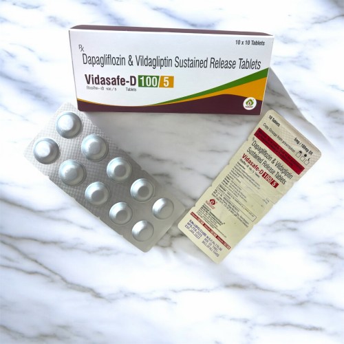 | Description: | VIDASAFE D 100/5 Tablet is a combination oral antidiabetic medication containing Vildagliptin 100mg and Dapagliflozin 5mg. This dual-action therapy is designed for type 2 diabetes mellitus to help control blood sugar levels more effectively. Vildagliptin is a DPP-4 inhibitor that increases incretin hormones, enhancing insulin release and reducing glucagon secretion. Dapagliflozin is an SGLT2 inhibitor that reduces glucose reabsorption in the kidneys, promoting urinary glucose excretion and lowering blood sugar. This combination offers synergistic glucose-lowering effects, improving glycemic control with a lower risk of hypoglycemia. |