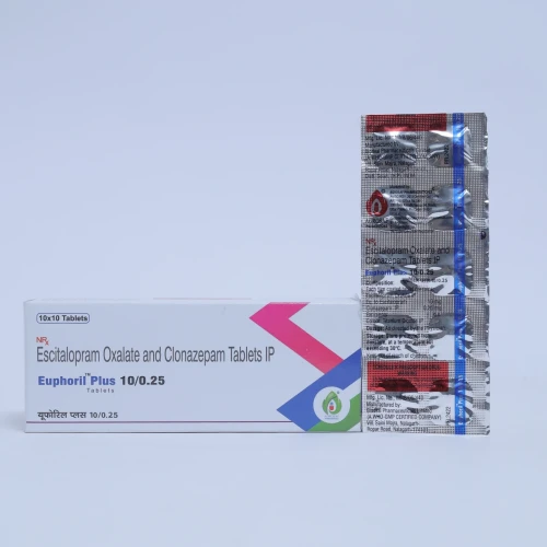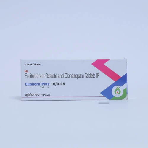 | Description: | EUPHORIL PLUS 10/0.25 Tablet is a combination medicine containing Escitalopram Oxalate 10mg and Clonazepam 0.25mg, designed for the management of depression, anxiety disorders, and panic attacks. Escitalopram (10mg) is a selective serotonin reuptake inhibitor (SSRI) that improves mood, emotional stability, and overall mental health. Clonazepam (0.25mg) is a benzodiazepine that provides fast relief from acute anxiety, nervousness, and panic attacks. This combination ensures both long-term mood stabilization and short-term relief from anxiety symptoms, making it suitable for patients needing comprehensive mental health support. |