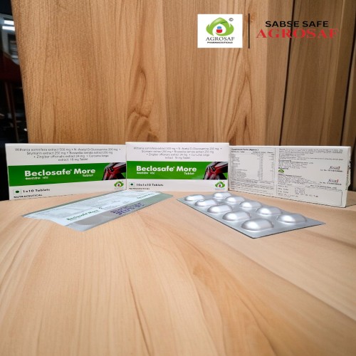 | Description: | BECLOSAFE MORE Tablet is a herbal nutraceutical formulation designed to support joint health, reduce inflammation, and promote overall wellness. It contains Withania somnifera Extract 500 mg, N‑Acetyl D‑Glucosamine 200 mg, Silymarin Extract 250 mg, Boswellia serrata Extract 250 mg, Zingiber officinale Extract 24 mg, and Curcuma longa Extract 18 mg. These ingredients work synergistically to provide antioxidant, anti-inflammatory, and joint-supportive effects. Withania somnifera (Ashwagandha) helps reduce stress and supports overall vitality, while Boswellia serrata and Curcuma longa help relieve joint inflammation. N-Acetyl D-Glucosamine supports cartilage health, and Silymarin provides antioxidant and liver-supportive properties. BECLOSAFE MORE Tablet is often recommended to support the management of Osteoarthritis, Joint Pain, and Inflammatory Disorders. |