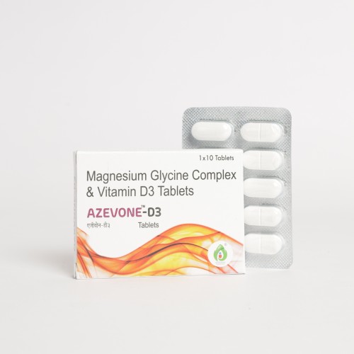 | Description: | AZEVONE-D3 Tablet is a nutritional supplement formulated to support bone health, muscle function, and overall metabolic balance. It contains Magnesium Glycinate (Magnesium Glycine Complex) 250 mg and Vitamin D3 1000 IU. Magnesium Glycine Complex is a highly bioavailable form of magnesium that helps maintain normal muscle and nerve function, supports bone strength, and plays an important role in energy production. Vitamin D3 enhances calcium absorption and contributes to the maintenance of healthy bones, teeth, and immune function. AZEVONE-D3 Tablet is commonly recommended for individuals with Vitamin D Deficiency, Magnesium Deficiency, Muscle Cramps, and Bone Weakness. |