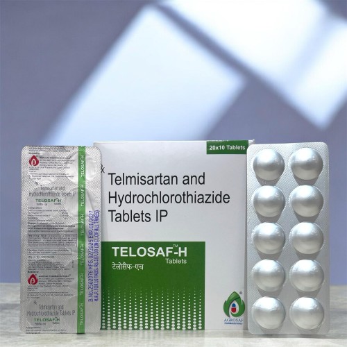| Description: | TELOSAF H Tablet is a combination of Telmisartan 40mg (an angiotensin II receptor blocker – ARB) and Hydrochlorothiazide 12.5mg (a thiazide diuretic), used for the treatment of hypertension (high blood pressure). Telmisartan relaxes blood vessels to improve blood flow, while Hydrochlorothiazide helps eliminate excess salt and water from the body. This dual-action formulation provides effective and sustained blood pressure control and reduces cardiovascular risk. |