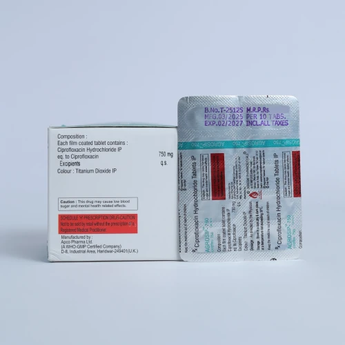 | COMPOSITION: | Each Film Coated Tablet Contains: Ciprofloxacin Hydrochloride Ip Eq. To Ciprofloxacin 750 Mg, Excipients Q.s. Colour: Titanium dioxide ip |