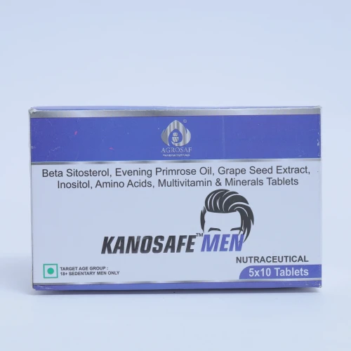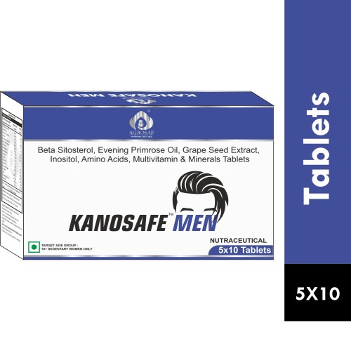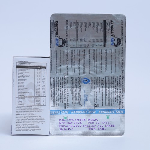 | Description: | KANOSAFE MEN Tablet is a comprehensive nutraceutical formulation designed to support men’s health and overall vitality. It contains Beta Sitosterol 50 mg, Biotin 40 mcg, Copper 1 mg, Iron 10 mg, Selenium 40 mcg, Zinc 12 mg, Evening Primrose Oil 20 mg, Folic Acid 100 mcg, Grape Seed Extract 20 mg, Inositol 5 mg, L-Arginine 10 mg, L-Lysine 30 mg, L-Methionine 50 mg, N-Acetylcysteine 50 mg, Vitamin B1 1.1 mg, Vitamin B3 14 mg, Vitamin B6 1.9 mg, and Vitamin D2 15 mcg. This balanced combination of vitamins, minerals, amino acids, and antioxidants helps support energy metabolism, immune health, reproductive health, and overall well-being in men. KANOSAFE MEN Tablet is commonly used to support male vitality, nutritional balance, and antioxidant protection. |