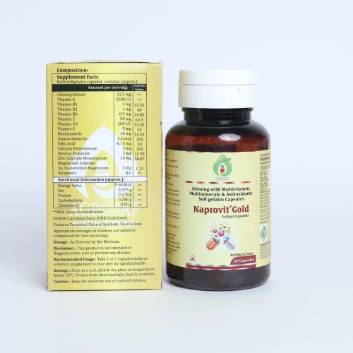 | Description: | Naprovit Gold Capsule is a premium multivitamin and multimineral health supplement fortified with essential vitamins, minerals, antioxidants, and trace elements. Specially designed to improve stamina, immunity, and vitality, it helps restore energy levels, reduces fatigue, and supports overall wellness. It is ideal for individuals with nutritional deficiencies, those recovering from illness, or anyone seeking enhanced daily performance. |