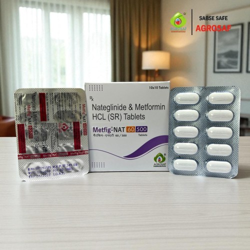 | Description: | METFIG-NAT 60/500 Tablet is an oral antidiabetic medication used to improve glycemic control in patients with Type 2 Diabetes Mellitus. It contains Nateglinide 60 mg and Metformin Hydrochloride (Sustained Release) 500 mg. Nateglinide belongs to the meglitinide class of antidiabetic drugs and works by stimulating the pancreas to release insulin, especially around meal times, thereby helping control post-meal blood sugar spikes. Metformin reduces glucose production in the liver and improves the body’s sensitivity to insulin. The combination helps achieve better overall blood sugar control by targeting both fasting and postprandial glucose levels. METFIG-NAT 60/500 Tablet is generally prescribed along with diet and exercise to manage diabetes effectively. |