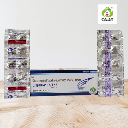 | Description: | CROPAM-P 0.5/12.5 Tablet is a combination medication containing Clonazepam 0.5 mg and Paroxetine (Controlled Release) 12.5 mg. It is indicated for the treatment of anxiety disorders, panic disorders, and depression associated with anxiety. Clonazepam provides rapid calming effects by enhancing GABA activity, while Paroxetine, an SSRI, works by increasing serotonin levels in the brain to improve mood and reduce long-term anxiety symptoms. This combination offers both immediate relief and sustained therapeutic benefits. |