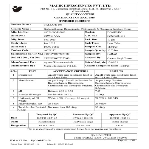 | COMPOSITION: | Beclomethasone Dipropionate(0.025% W/w) ,clotrimazole( 1% W/w), & Neomycin Sulphate(0.5% W/w) Cream |