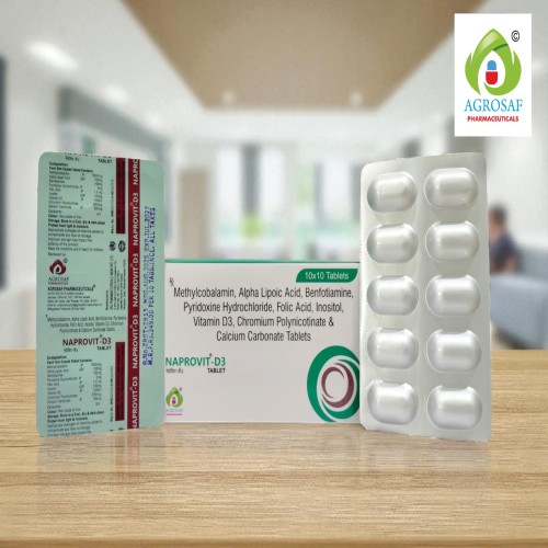 | Description: | Naprovit D3 Tablet is a nutritional supplement containing Alpha Lipoic Acid, Benfotiamine, Calcium Carbonate, Chromium Picolinate, Folic Acid, Inositol, Methylcobalamin, Pyridoxine Hydrochloride, and Vitamin D3. It is mainly used to support nerve health, bone strength, and overall metabolic functions. This combination helps in managing neuropathy, vitamin deficiencies, and improving energy levels. |