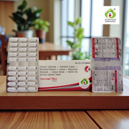 | Description: | Azevone Max Tablet is a nutritional supplement that combines Calcium Carbonate, Vitamin D3, Zinc, Magnesium, Copper, Selenium, L-Lysine, and Boron. It helps improve bone strength, supports immune health, and promotes better absorption of essential minerals for overall wellbeing. It is commonly used in the prevention of osteoporosis, vitamin D deficiency, and mineral deficiency states. |