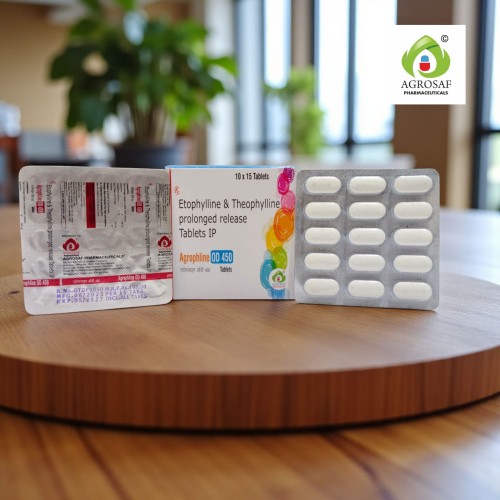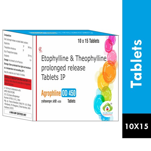 | Description: | AGROPHLINE-OD 450 Tablet is a bronchodilator combination containing Etofylline 346 mg and Theophylline 104 mg. It is commonly used in the management of respiratory conditions such as Asthma, Chronic Obstructive Pulmonary Disease (COPD), and other breathing disorders. Etofylline and Theophylline work by relaxing the smooth muscles of the airways and improving airflow to the lungs. This helps relieve symptoms such as shortness of breath, wheezing, and chest tightness. AGROPHLINE-OD 450 Tablet provides long-lasting bronchodilation and supports better respiratory function. |