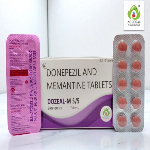 | Description: | DOZEAL-M 5/5 Tablet is a combination medication containing Donepezil Hydrochloride 5 mg and Memantine 5 mg, used in the management of Alzheimer's disease and other cognitive disorders associated with memory decline. Donepezil belongs to the class of cholinesterase inhibitors and works by increasing the level of acetylcholine in the brain, which helps improve communication between nerve cells. Memantine is an NMDA receptor antagonist that helps regulate glutamate activity in the brain, protecting nerve cells from damage. Together, this combination helps improve cognitive function, memory, and daily functioning in patients with Alzheimer’s disease. |