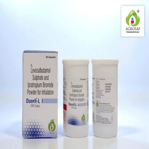 | Description: | DUORIT-L DPICAPS is a combination inhalation therapy containing Levosalbutamol Sulphate 100 mcg, a short-acting bronchodilator, and Ipratropium Bromide 40 mcg, an anticholinergic agent. It is used for the management of asthma, chronic obstructive pulmonary disease (COPD), and bronchospasm. Levosalbutamol provides rapid relief by relaxing airway muscles, while Ipratropium helps reduce bronchoconstriction and mucus secretion. This dual-action formulation ensures improved airflow, quick symptom relief, and enhanced respiratory function, delivered through DPI (Dry Powder Inhalation) caps. |