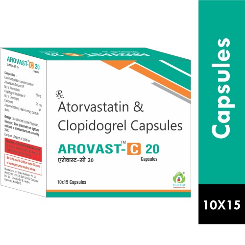 | Description: | AROVAST-C 20 Capsule is a combination cardiovascular medicine containing Atorvastatin (20 mg) and Clopidogrel (75 mg), formulated for effective cholesterol management and prevention of blood clot formation. Atorvastatin, a higher-strength statin, helps significantly reduce LDL (bad cholesterol) and triglycerides while increasing HDL (good cholesterol). Clopidogrel acts as an antiplatelet agent, preventing platelets from aggregating and forming clots. This combination is ideal for patients at high risk of heart attack, stroke, and other cardiovascular disorders, especially those requiring stronger lipid control along with antiplatelet therapy. |