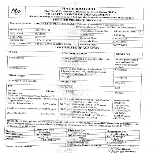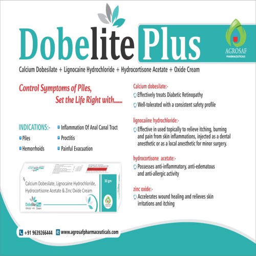 | COMPOSITION: | Calcium Dobisilate 0.5% W/w,lignocaine 3 %,hydrocortisone Acetate 0.25 %,zinc Oxide 5 % |