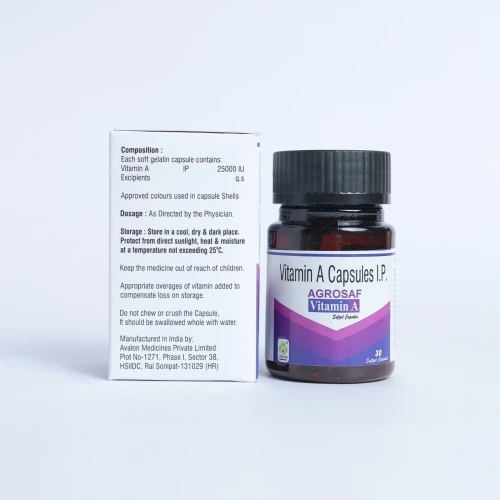 | Description: | AGROSAF Vitamin-A 25000 IU Soft Gelatin Capsules are a high-potency nutritional supplement formulated to support overall health, particularly vision, immunity, and skin integrity. Vitamin A is a fat-soluble vitamin essential for maintaining healthy eyesight, boosting immune response, and promoting proper growth and development. These softgel capsules ensure optimal absorption and are ideal for individuals with Vitamin A deficiency or increased nutritional requirements. |