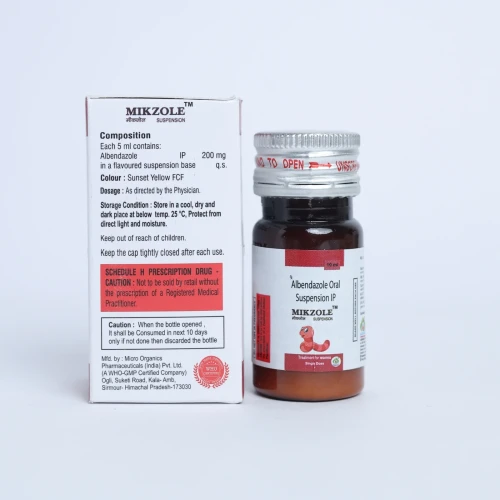 | Description: | Mikzole Suspension contains Albendazole 200 mg per 10 ml, a broad-spectrum anthelmintic medication. It is highly effective against a wide range of intestinal parasitic worms such as roundworms, hookworms, whipworms, and tapeworms. Albendazole works by inhibiting the polymerization of tubulin into microtubules, disrupting the metabolism of parasites and causing their death. Mikzole Suspension is especially formulated in liquid form for easy administration in children and adults who have difficulty swallowing tablets. Alternate Brand - Zentel Suspension (GlaxoSmithKline) - Wormin Suspension (Cipla) - Bendex Suspension (Cadila Pharmaceuticals) - Alworm Suspension (Ipca Laboratories) |