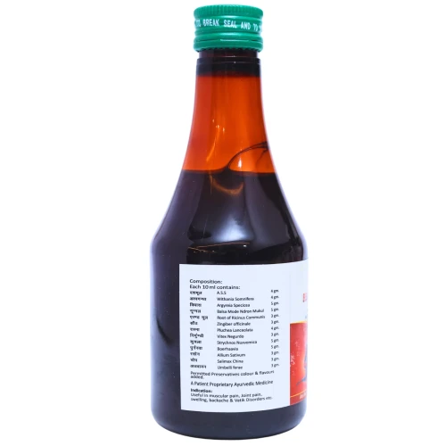 | COMPOSITION: | Each 10ml Contains: Dashmool (a.s.s) 4gm + Ashwagandha (withania Somnifera) 4gm+ Vidhara (argyreia Speciosa) 5gm + Goggal (balsa Mode Ndron Mukul) 5gm+ Arand Mool (root Of Ricinus Communis) 3gm+ Soth (zingiber Officinale) 3gm+ Raasna (pluchea Lanceolata) 4gm +nirgundi (vitex Negurdo) 3gm + Kuchla (strychnos Nuxvomica) 5gm+ Purnnava (boerhaavia) 5gm+ Rasone (allium Sativum) 5gm +chop (salimax China) 3gm+ Ajvain (umbelli Ferae) 3gm |