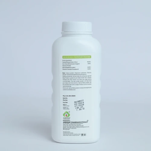| Description: | AGROSAF BABY POWDER is a premium, Ayurvedic-inspired formulation crafted to offer gentle and effective skin protection for infants. Blended with 10% Yashad Bhasma (calx of zinc), it provides natural antibacterial and anti-inflammatory properties, helping to soothe diaper rashes and prevent skin irritation. The addition of corn starch (Foeniculum vulgare) ensures superior moisture absorption, keeping your baby’s skin dry and fresh. Enriched with aloe vera powder (Aloe barbadensis miller) and vitamin E acetate (tocopherol), it nourishes and calms delicate skin while supporting healing and softness. |