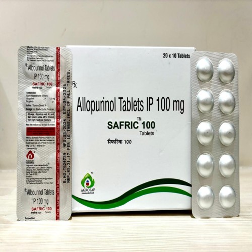 SAFRIC 100 Tablet is used to reduce uric acid levels and prevent gout attacks and uric acid kidney stones.