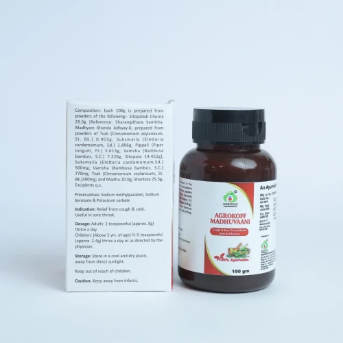 | Description: | AGROKOFF MADHUVAANI is a traditional Ayurvedic malt syrup formulated to provide effective relief from cough, cold, throat irritation, and respiratory congestion. Crafted using classical references from the Sharangdhara Samhita, this herbal remedy combines time-tested ingredients like Sitopaladi Churna, Madhu (Honey), and Sharkara (Sugar) to offer soothing, natural respiratory support. |