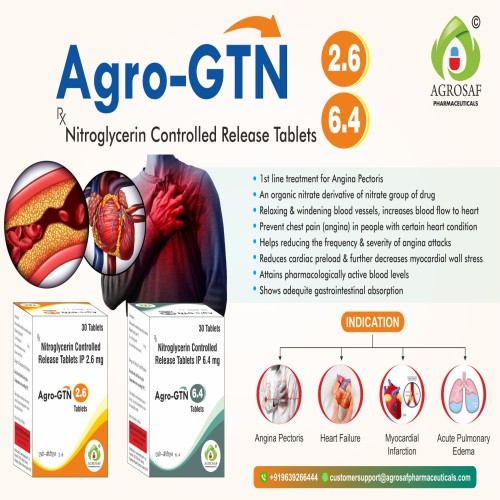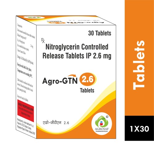 | Description: | AGRO-GTN 2.6 Tablet contains Nitroglycerin 2.6mg, a nitrate vasodilator used for the prevention and management of angina pectoris (chest pain). It works by relaxing and widening blood vessels, improving blood flow to the heart muscle and reducing cardiac workload. Nitroglycerin helps decrease myocardial oxygen demand while increasing oxygen supply, making it highly effective in preventing angina attacks and improving exercise tolerance in patients with coronary artery disease. |