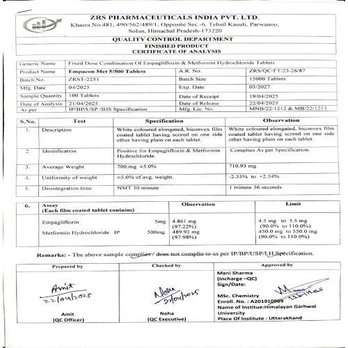 | COMPOSITION: | Each Film Coated Tablet Contains: Empagliflozin 5 Mg, Metformin Hydrochloride 500 Mg, Excipients Q.s. Colour: Approved Colour Used. |