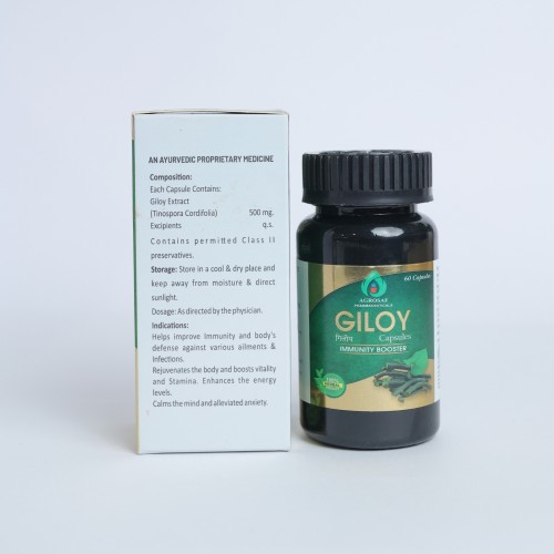 | Description: | : Agrosaf Giloy Capsule contains 500 mg of Giloy Extract (Tinospora cordifolia) per capsule. Giloy, also known as Guduchi, is a revered herb in Ayurveda, often termed as "Amrita" or the "elixir of life" due to its numerous health benefits. This herbal supplement is renowned for its immune-boosting, anti-inflammatory, and detoxifying properties. Regular consumption of Agrosaf Giloy Capsule supports overall health and well-being. |