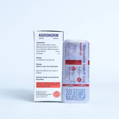 | Description: | AGRONORM Tablet contains Metoclopramide 10mg, a gastrointestinal prokinetic and antiemetic agent used to treat nausea, vomiting, delayed gastric emptying, and other digestive disorders. Metoclopramide works by enhancing the motility of the upper gastrointestinal tract and increasing the tone of the lower esophageal sphincter, promoting faster gastric emptying and reducing reflux. It is commonly used in conditions such as gastroesophageal reflux disease (GERD), post-operative nausea, migraine-associated nausea, and diabetic gastroparesis. |
