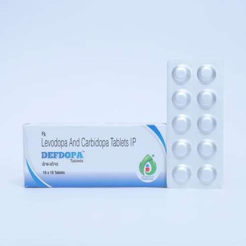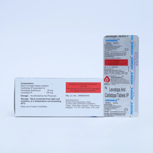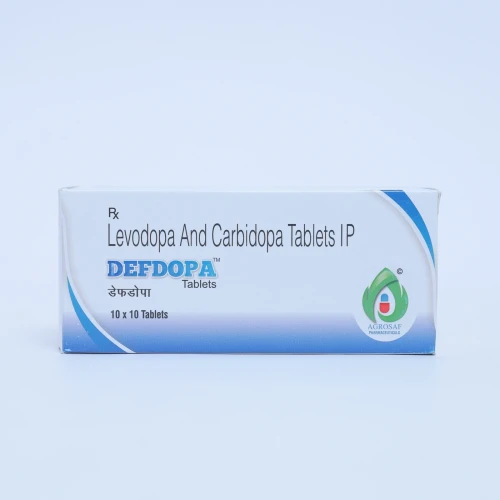 | Description: | DEFDOPA Tablet is a combination of Levodopa 100mg and Carbidopa 25mg, used in the management of Parkinson’s disease and related movement disorders. Levodopa is converted into dopamine in the brain, helping to restore the deficient neurotransmitter responsible for movement control. Carbidopa inhibits the peripheral breakdown of Levodopa, ensuring more Levodopa reaches the brain, thereby improving efficacy and reducing side effects like nausea. This combination helps improve motor symptoms such as tremors, stiffness, and slowness of movement in patients with Parkinson’s disease. |