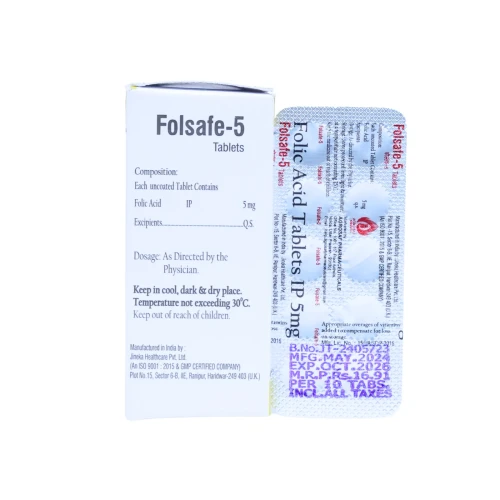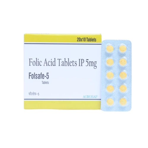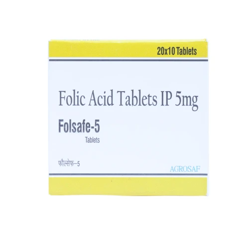| Description: | FOLSAFE-5 Tablet contains Folic Acid 5mg, a vitamin B9 supplement essential for red blood cell formation, DNA synthesis, and overall cellular health. It is commonly used for the prevention and treatment of folate deficiency anemia, and is especially important during pregnancy to support fetal development and prevent neural tube defects. FOLSAFE-5 plays a crucial role in maintaining healthy blood cells and proper metabolic function. |