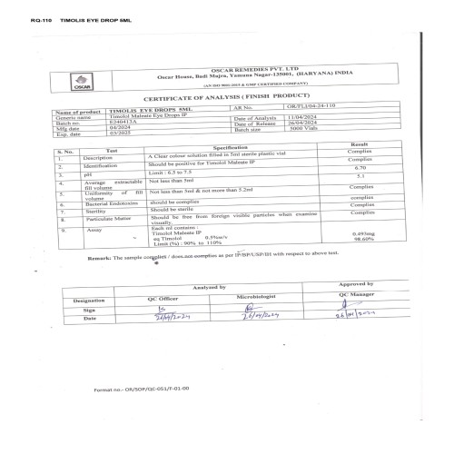 | COMPOSITION: | Timolol Maleate 0.5% W/v |