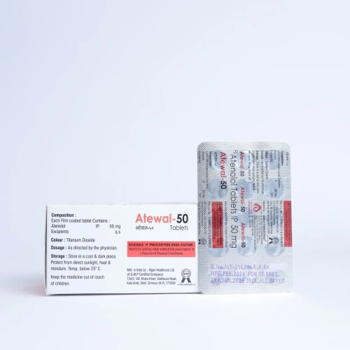 | Description: | ATEWAL 50 Tablet contains Atenolol 50 mg, a beta-blocker commonly used for the treatment of high blood pressure (hypertension), angina (chest pain), and certain heart rhythm disorders. Atenolol works by blocking beta-adrenergic receptors in the heart, which slows down the heart rate and reduces the force of heart contractions. This action helps lower blood pressure, decrease the workload on the heart, and improve blood circulation. ATEWAL 50 Tablet is widely prescribed in cardiology to help prevent serious cardiovascular conditions such as heart attacks, stroke, and complications associated with uncontrolled hypertension. It is suitable for long-term management of heart health under medical supervision. |