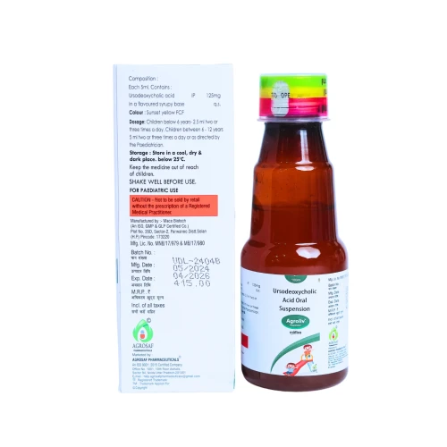 | Description: | AGROLIV SYRUP is a pharmaceutical formulation containing 125 mg of Ursodeoxycholic Acid (UDCA) per 5 ml, designed to support liver health and manage various liver-related conditions. This medication is primarily used to treat primary biliary cirrhosis, a chronic liver disease, and to dissolve certain types of gallstones. By improving bile flow and reducing bile acid toxicity, AGROLIV SYRUP helps in protecting liver cells and promoting overall liver function. |