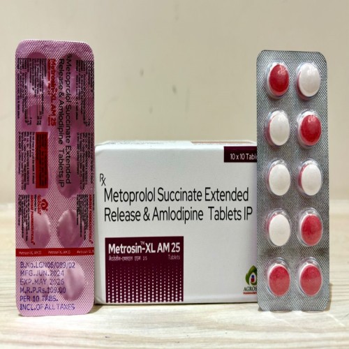| Description: | METROSIN XL AM 25 Tablet is a fixed-dose combination of Metoprolol Succinate 23.75mg (ER, equivalent to Metoprolol Tartrate 25mg) and Amlodipine Besylate 5mg, designed for effective management of hypertension and certain cardiovascular conditions. Metoprolol Succinate (ER 25mg) is a beta-1 selective blocker that reduces heart rate, myocardial oxygen demand, and blood pressure. Amlodipine 5mg is a calcium channel blocker that relaxes blood vessels, reduces vascular resistance, and improves blood flow. The combination provides complementary mechanisms to control blood pressure, prevent angina, and reduce cardiovascular risk, while simplifying therapy with once-daily dosing. |