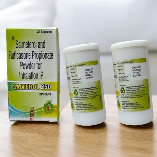 | Description: | SALTEROL 250 Rotacap is a combination inhalation therapy containing Salmeterol 50 mcg, a long-acting bronchodilator (LABA), and Fluticasone Propionate 250 mcg, a corticosteroid. It is used for the maintenance treatment of asthma and chronic obstructive pulmonary disease (COPD). Salmeterol provides prolonged bronchodilation by relaxing airway muscles, while Fluticasone reduces inflammation in the lungs. This dual-action therapy helps in improving breathing, reducing exacerbations, and maintaining long-term respiratory control, delivered effectively via rotacap inhalation. |