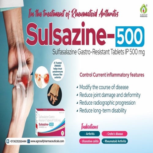 | Description: | SULSAZINE-500 Tablet contains Sulfasalazine 500mg, a disease-modifying anti-rheumatic drug (DMARD) widely used in the treatment of rheumatoid arthritis, ulcerative colitis, and other inflammatory bowel diseases. It works by reducing inflammation in the joints and intestines, thereby alleviating pain, swelling, and stiffness. Sulfasalazine also helps in slowing disease progression and maintaining long-term symptom control. |