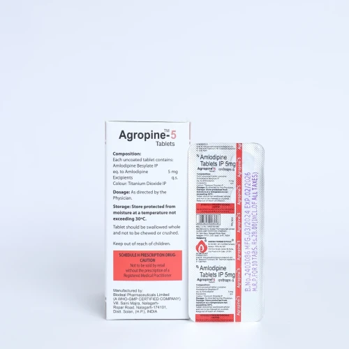 | Description: | AGROPINE 5MG Tablet contains Amlodipine 5 mg, a calcium channel blocker used for the treatment of high blood pressure (hypertension) and certain types of heart-related chest pain (angina). It works by relaxing and widening blood vessels, allowing blood to flow more easily and reducing the workload on the heart. By improving blood circulation, Amlodipine helps lower blood pressure and reduces the risk of serious cardiovascular complications such as heart attacks and strokes. It also helps relieve chest pain by improving oxygen supply to the heart muscles. AGROPINE 5MG Tablet is widely prescribed in cardiology and general medicine for long-term management of hypertension and heart health. |