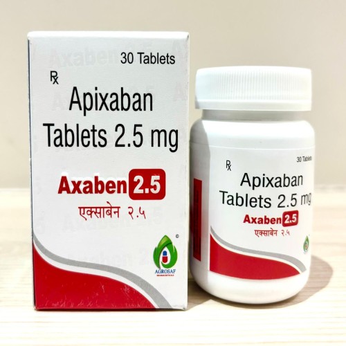 AXABEN 2.5 Tablet is used to prevent blood clots and reduce the risk of stroke, DVT, and pulmonary embolism.