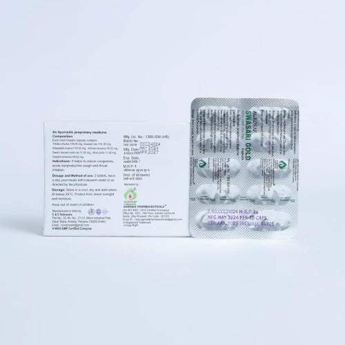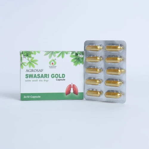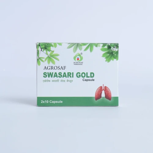| Description: | AGROSAF Swasari Gold Capsule is a powerful Ayurvedic blend formulated to relieve cough, cold, throat irritation, asthma, and chronic bronchial issues. Enriched with traditional herbs like Tulsi, Mulethi, Vanshlochan, Pippali, and Abhrak Bhasma, it helps to clear mucus, soothe the respiratory tract, and support lung detox. Key Features: Relieves Cough & Congestion Supports Healthy Lung Function Boosts Respiratory Immunity Naturally 100% Ayurvedic with No Harmful Chemicals |
