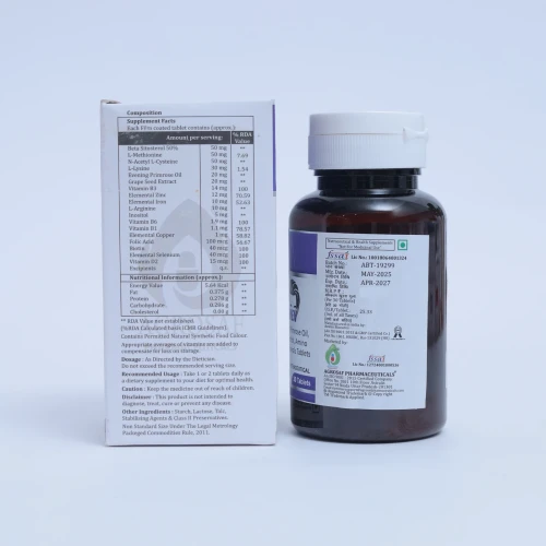 | COMPOSITION: | Beta Sitosterol 50% 50 Mg+biotin 40 Mcg+elemental Copper 1 Mg+elemental Iron 10 Mg+elemental Selenium 40 Mcg+elemental Zinc 12 Mg+evening Primrose Oil 20 Mg+folic Acid 100 Mcg+grape Seed Extract 20 Mg+inositol 5 Mg+l-arginine 10 Mg+l-lysine 30 Mg+l-methionine 50 Mg+n-acetylcysteine 50 Mg+vitamin B1 1.1 Mg+vitamin B3 14 Mg+vitamin B6 1.9 Mg+vitamin D2 15mcg |