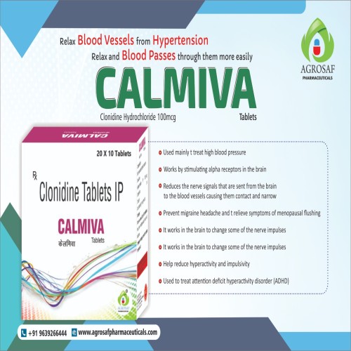| Description: | CALMIVA Tablet contains Clonidine 100 mcg, an alpha-2 adrenergic agonist used primarily for the management of hypertension (high blood pressure). It works by reducing sympathetic outflow from the brain, thereby lowering heart rate and relaxing blood vessels. In addition to hypertension, Clonidine is also used in certain cases for anxiety, ADHD, and withdrawal symptoms. CALMIVA Tablet helps in maintaining stable blood pressure and improving cardiovascular health. |