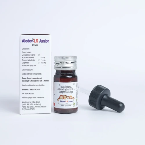 | Description: | ALODEV LS Junior Drop is a pediatric respiratory syrup specially formulated for effective relief from productive cough, congestion, and breathing difficulty. It contains a powerful triple-action combination: Ambroxol – a mucolytic that breaks down thick mucus, Levosalbutamol – a bronchodilator that opens airways for easier breathing, and Guaifenesin – an expectorant that helps in clearing mucus from the lungs. This formulation is gentle and effective for children, helping them breathe freely and recover faster from respiratory conditions like bronchitis and asthma-related cough. |
