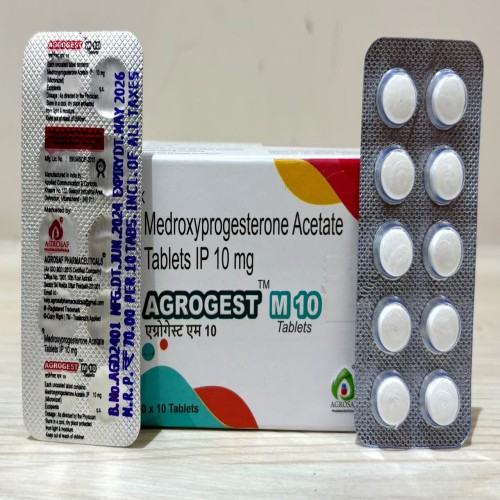 | Description: | AGROGEST M10 Tablet contains Medroxyprogesterone Acetate 10mg, a synthetic progestin used in the management of menstrual disorders, abnormal uterine bleeding, amenorrhea, and as part of hormone replacement therapy (HRT). Medroxyprogesterone works by mimicking the action of natural progesterone, helping regulate the menstrual cycle, stabilize the endometrial lining, and manage hormonal imbalances. It is also used in specific gynecological conditions and fertility-related treatments under medical supervision. |