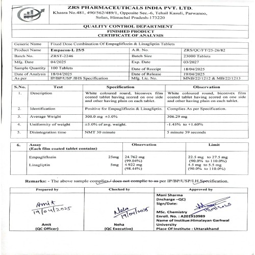 | How to Use: | Take EMPACON-L 25/5 Tablet as prescribed by a healthcare professional Usually taken once daily, preferably in the morning Swallow the tablet whole with water Can be taken with or without food Maintain adequate hydration |