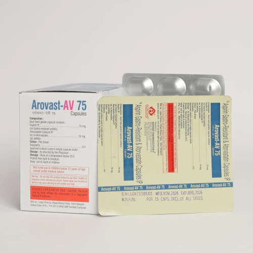 | Description: | AROVAST AV 75 Capsule is a combination medicine formulated with Atorvastatin and Aspirin, used to prevent cardiovascular diseases such as heart attack and stroke. Atorvastatin helps lower bad cholesterol (LDL) and triglyceride levels while increasing good cholesterol (HDL). Aspirin, in a low dose, acts as an antiplatelet agent that prevents the formation of harmful blood clots. This combination is widely recommended for patients at risk of cardiovascular complications and for long-term heart health management. |