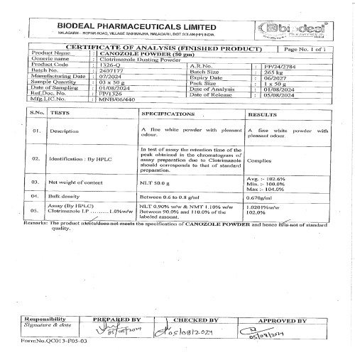 | Description: | CANOZOLE POWDER is a broad-spectrum antifungal dusting powder that contains Clotrimazole 1% w/w. It is used topically for the treatment and prevention of fungal infections of the skin, such as athlete's foot, jock itch, ringworm, and candidal intertrigo. The powder form helps in keeping the affected area dry and sweat-free, creating an unfavorable environment for fungal growth. |