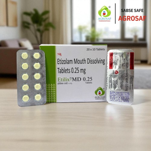 ETILIX MD 0.25 Tablet is used to treat anxiety, panic attacks, and stress-related sleep disturbances with rapid onset due to its mouth-dissolving formulation.