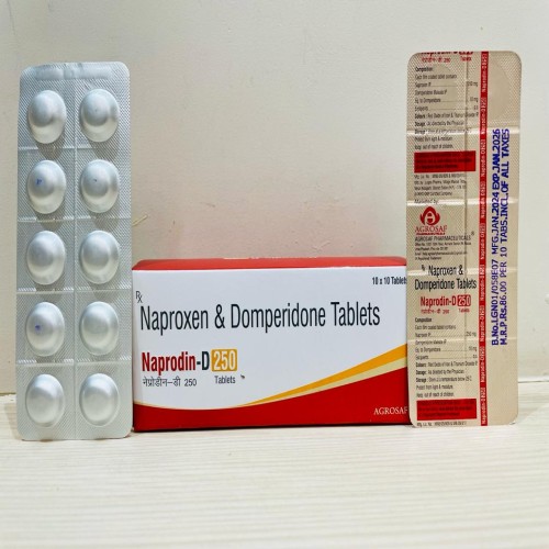 | Description: | NAPRODIN-D 250 Tablet is a combination of Naproxen 250mg, a non-steroidal anti-inflammatory drug (NSAID), and Domperidone 10mg, a dopamine antagonist with antiemetic properties. This formulation is designed to provide effective relief from pain and inflammation while preventing associated nausea and gastric discomfort. Naproxen 250mg works by inhibiting prostaglandin synthesis, thereby reducing pain, inflammation, and swelling. Domperidone 10mg enhances gastric motility and helps prevent nausea and vomiting, improving patient tolerance to NSAID therapy. This combination is commonly used in conditions such as migraine, musculoskeletal pain, and inflammatory disorders where pain is accompanied by gastric symptoms. |