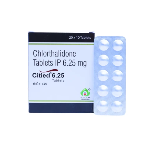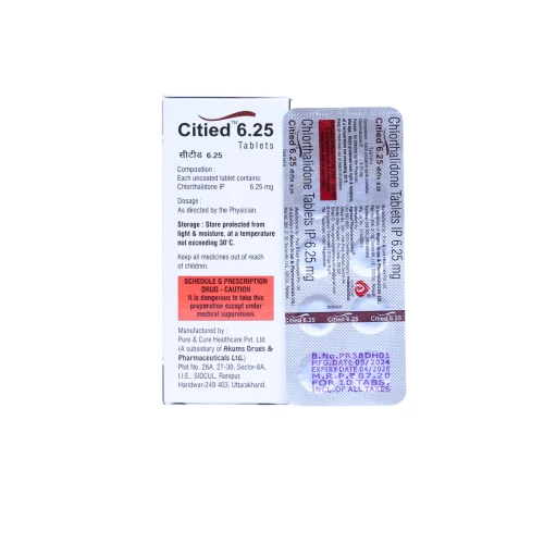 | Description: | CITIED 6.25 Tablet contains Chlorthalidone 6.25 mg, a thiazide-like diuretic (water pill) used to treat high blood pressure and fluid retention (edema). It works by increasing the elimination of excess salt and water through urine, helping to reduce blood volume and lower blood pressure. CITIED 6.25 Tablet is often prescribed as a low-dose option for patients requiring gradual blood pressure control and long-term cardiovascular management. |